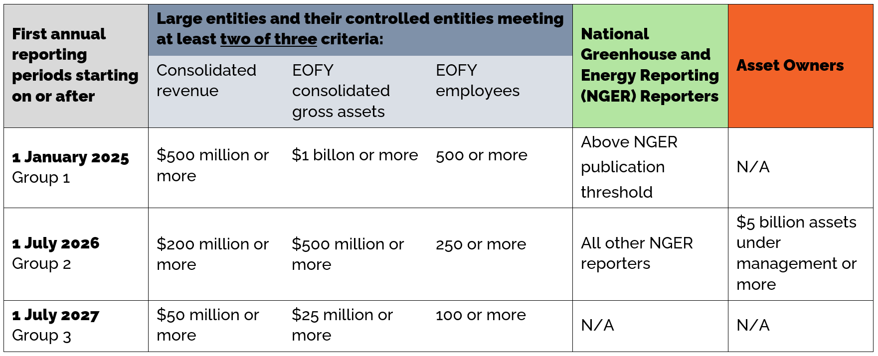 Use the table below to determine when your entity may be required to comply. The regime will apply to an entity for its first financial year commencing on or after the relevant date in the table.